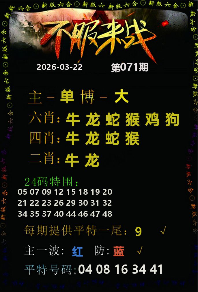 071期:A级大公开:676383.COM长跟必赢 071期四肖:【牛龙虎鼠】 八码:【06 30 03 27 05 17 31 43】 071期三肖:【牛龙虎】 六码:【06 30 03 27 05 17】 071期二肖:【牛龙】 四码:【06 30 03 27】 071期:一肖一码【牛06】信心十足,大胆下注!
